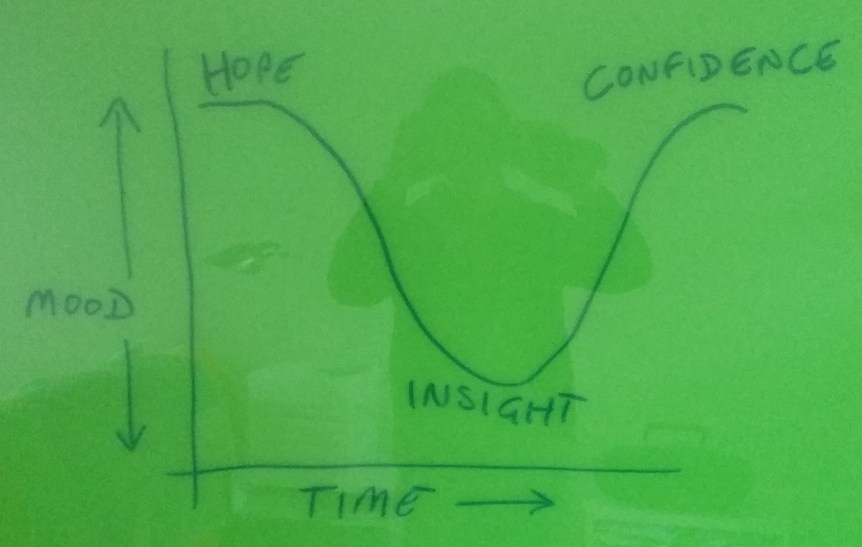Chip and Dan Heath’s Switch: How to Change Things when Change is Hard reports a useful analysis of the emotional shape of projects.* At the start, spirits are high. As you get stuck into the project, people start to get bogged down – things go wrong, unforeseen obstacles emerge – and the initial positive emotional tone drops. As you get towards the end, when you’ve worked through the problems and the finish line is in sight, spirits rise again. These three phases are labeled Hope, Insight, and Confidence.