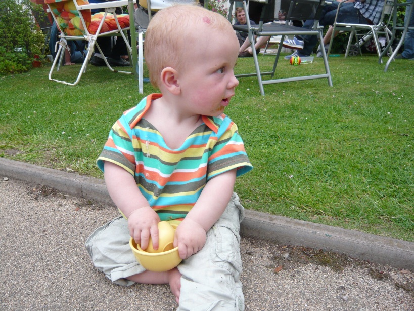 At this stage, taking steps was an activity in its own right, but if he wanted to propel himself he went back to crawling. But one day he suddenly gave up crawling, and took to walking everywhere. Journeys were frequently interrupted, sometimes by his well-rehearsed land-on-bottom routine, other times by the new fall-over forward thing that comes along when you start to get forward momentum. (And sometimes there were tears when he landed with a bump, but they didn’t last long unless he was getting to the time to need food or sleep anyway.) But pottering around had enough intrinsic interest that the interruptions didn’t seem to be a source of frustration in themselves.