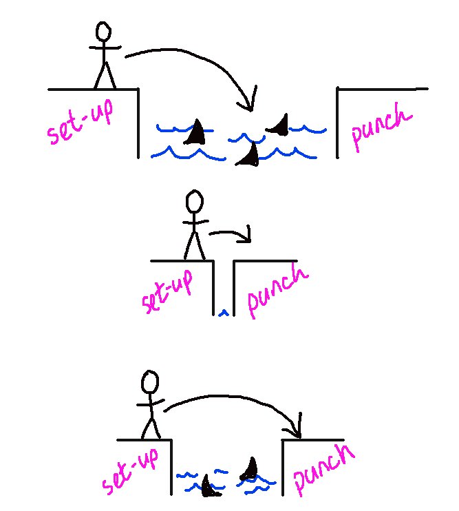The set-up and the punchline are two cliffs. If the audience can’t make it from the set-up to the punchline, they fall into the shark-infested waters of comedy death (I’m quoting pretty near verbatim there). If the cliffs are too near, there’s no thrill. So the trick is to get the cliffs the right distance apart. In class, a joke that’s not quite working – if it’s forced, or obscure – will be described as having cliffs that are too far apart. (This metaphor was the brain-child of Jerry Seinfeld, and is cited in a book by Jimmy Carr and Lucy Greeves.)
