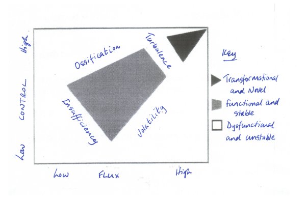 All caught up? Right, we were about to look at the group dynamic of a once-charismatic organisation that had settled into a happy and successful mode of operation. For this we are going to revisit Bradley and Pibram's diagram of the relationship between two key elements of a charismatic group: control and flux.