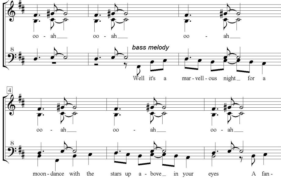 In some ways, melody and accompaniment textures provide fewer challenges than homophonic textures, because they have more built-in contrast. The parts singing the accompaniment patterns can set up a regular metrical framework to drape the tune over, in much the way that a band’s rhythm section frees a soloist up to play with and pull against the basic rhythmic structure.