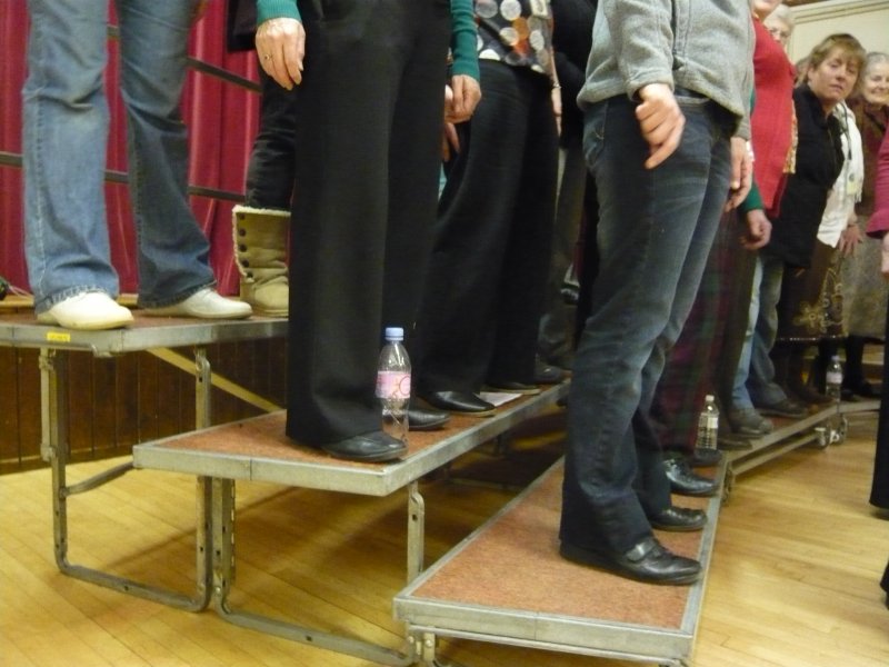 Toes to the front on the new risers!Wednesday evening took me back to Oxfordshire to have an evening’s coaching with a much expanded Harmony InSpires. Since I first visited them in 2008, they have increased in size by a good 50%, and have had to move to a new rehearsal venue to make room for everyone. Expanding membership is one of those things that people often think they need to do in order to become more successful, whereas in fact it is a result of things going well. People are attracted to participate where they can sense a buzz.