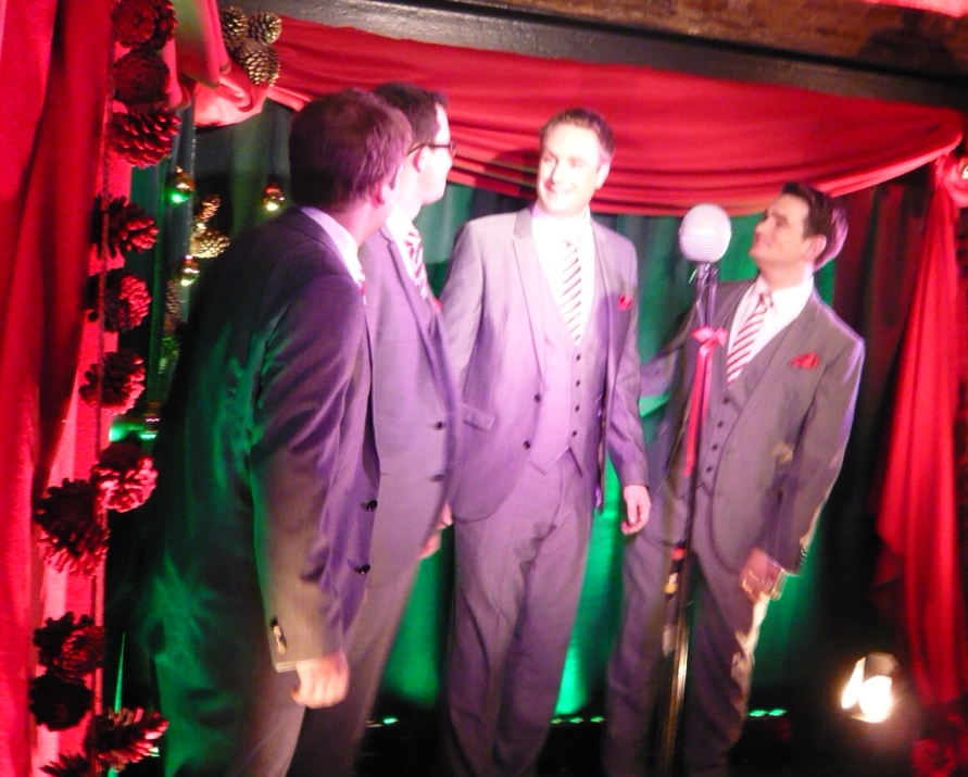 The audience was welcoming and enthusiastic in applause. Again, this makes sense – everyone had been invited to celebrate the new signing, and besides, being sung to by four self-evidently nice young men is an inherently pleasurable experience. But talking to the quartet afterwards, they seemed genuinely pleasantly surprised by the warmth of the reception. Joe remarked that they were getting laughs in places where they never had from barbershop audiences.