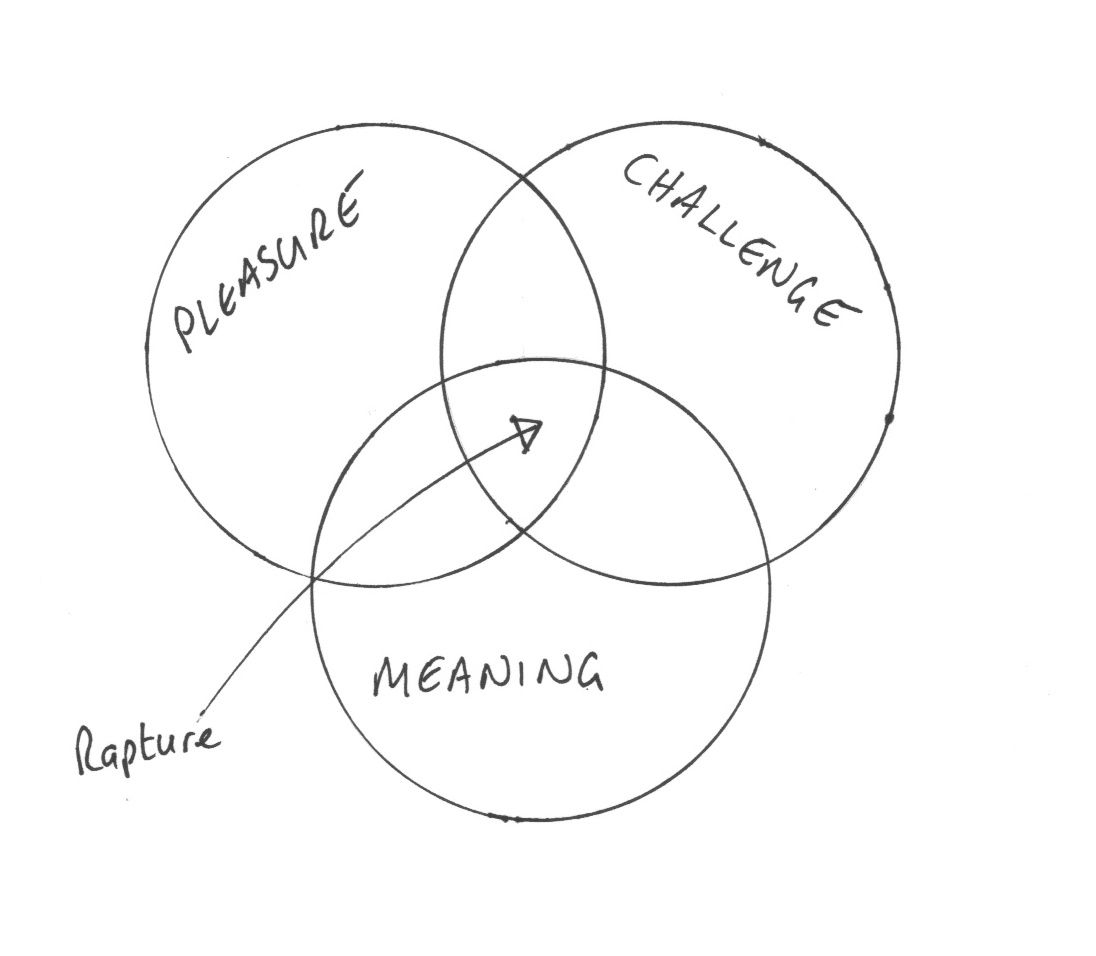 The authors of Mind Gym: Give me Time offer a useful analysis of happiness. They suggest that it operates in three dimensions, pleasure, challenge and meaning. Any activity that offers one of these will make us somewhat happy, one that offers two will feel very rewarding, and to get all three in one go leads to a state of rapture.