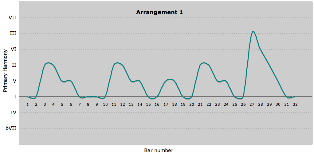 Here, the big striking move occurs at the start of the bridge, where we get the new melodic material. This creates a central focal point for the arrangement to build up towards and move away from. After this strong harmonic journey in bridge, the decision to come home via chord IV at the end counter-balances the activity with a sense of rest. However, I felt that using that same move in the second phrase lost some sense of energy or momentum, following the rather perky use of chord VI right at the start. And the graph looks a bit like a marquee that’s missing a tent-pole – the music rather sags just there.