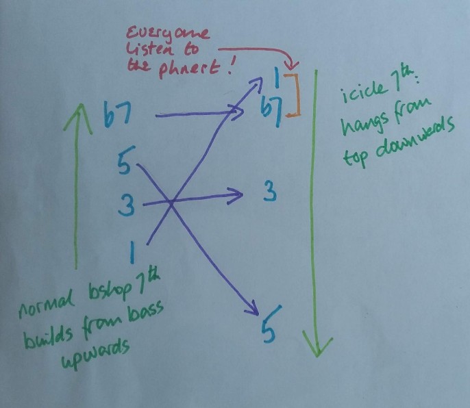 The energy generated by this clash is what holds the other two parts connected to the chord. So they need to listen out for it. If you’re dangling in the lower half of an icicle 7th and you take your ears away from that phnert above you, you risk dropping off the bottom and getting lost in the snow.