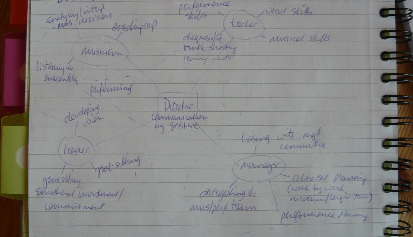 At the start of the session, I presented her with the diagram above as a starting point. There are multiple different ways you can divide up a conductor’s various roles, but this seemed as good a starting point as any – its purpose was not to provide an exhaustive theory of conducting, after all, it was just there to give focus and structure to our discussions.