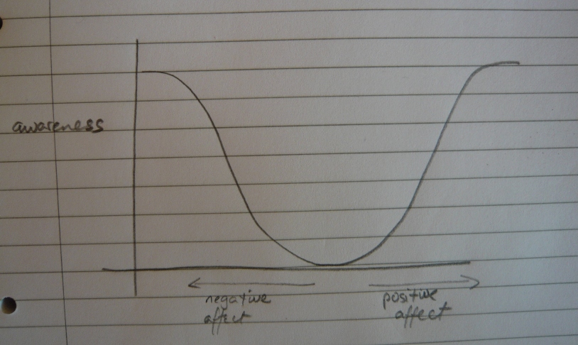 Inverse Yerkes-Dobson curve: Awareness increases with strength of affectThis assumption proved largely valid, though what I found more striking as we talked through them was that the content of some areas was significantly more self-evident than others. Awareness was much stronger in those areas of extreme response – either positively anxious or positively confident – than in the areas where she didn’t have particularly strong feelings, making a kind of inverted Yerkes-Dodson curve.