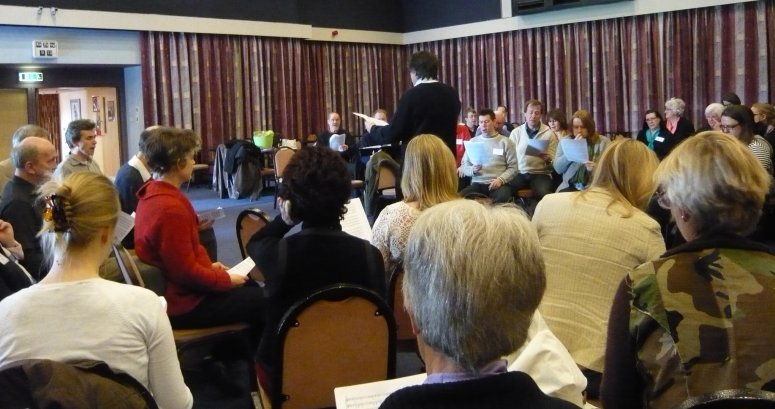 Jonathan Rathbone working his arrangement in the plenary sessionSunday 29th March saw hordes of a cappella singers congregating in Hounslow for a day that was billed as the inaugural event of a new British Contemporary A Cappella Society. Eight different groups participated in a day that involved coaching from ex-Swingle singers Jonathan Rathbone, Joanna Forbes, Wendy Nieper and Mark Williams, framed by plenary warm-up sessions, performances and workshopping one of Jonathan’s arrangements. I went along to observe and network (and being there without an ensemble earned me privilege of a badge that labelled me as ‘Individual Liz’ – something I shall treasure for all time), and came away with a notebook full of thoughts that will feed this blog for some posts to come.