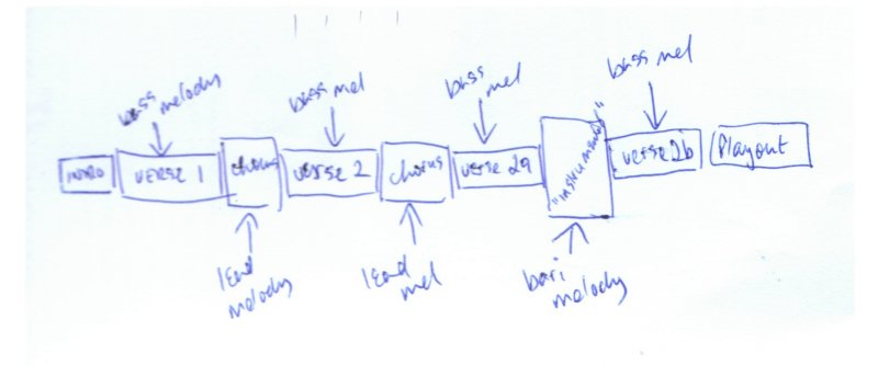 If it’s a standard kind of form, I’ll do this in my head, but if it’s long or unusual in any way or if I just need to think about it, I’ll draw a picture. Here, for instance, is the sketch I drew of the form of ‘Moondance’ when I was arranging it for Heartbeat chorus: