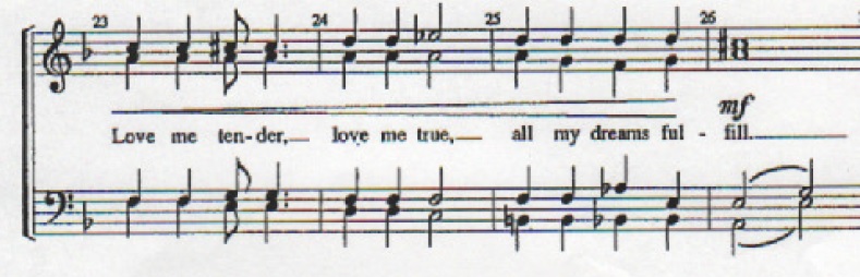 But there is another type of phrase-end swipe treatment that I am increasingly of the view is unhelpful to the performer. This is where it carries on over the barline to finish on the new primary harmony. (I am struggling a bit to think of examples I can show you for this because, while I am more than happy to point to specific charts for ‘here’s what we do’ type examples, I am less willing to point and say, ‘Hey don’t do that!’) It most often happens where the melody has a rest on the first beat of the phrase, so in an accompanied version the instrument(s) would play the chord that sets up the harmonic framework at the start of the rhythmic framework, and the voice would join in on beat 2.