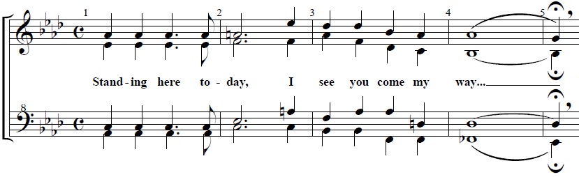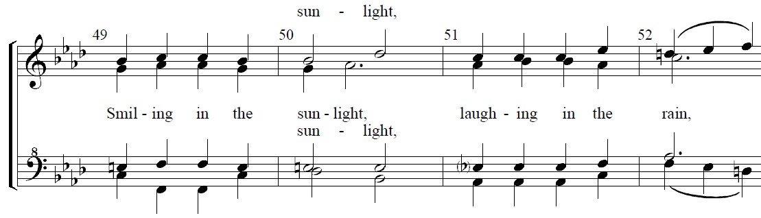 - Holding pattern swipe: where the melody cadences onto the final chord of the phrase, and the harmonies swipe away and back again. It’s not going anywhere, but it keeps things moving. (In fact, when I went a-hunting for examples, most of those I found involved some kind of voice-exchange, so whilst the swipe isn’t going anywhere in terms of its harmonic content, the melodic shape of the parts gives a sense of direction.)