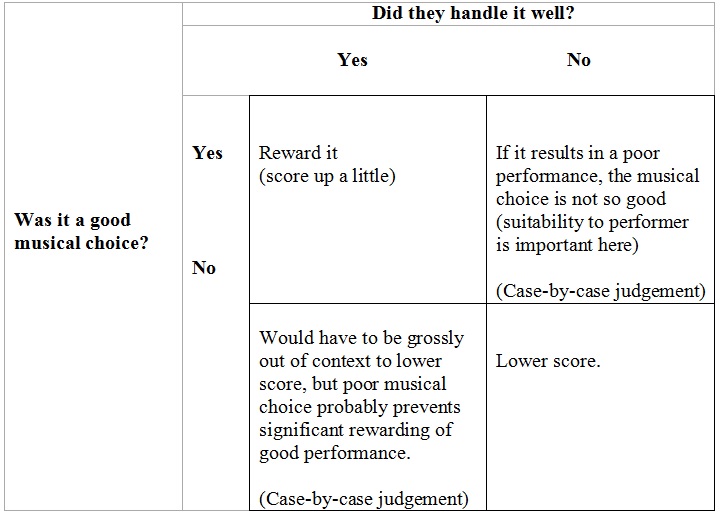 Now, back in my days in as a Music Category judge, there was some discussion about this, with the aim of triangulating between the quality of musical choice (did the tag fit the song?) and the quality of the performance produced (how well did the ensemble sing it?). Kevin Keller produced the following rather useful matrix to help judges decide how to inflect their score in such circumstances: